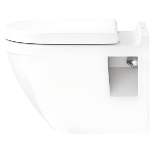 Cuvette suspendue Starck 3 DURAVIT en céramique sanitaire à fond creux pour 6L et 4,5L d’eau selon la norme EN 997. Forme extérieur lisse et fermée, rectangulaire devant arrondie en demi-cercle, Raccord mural avec dosseret pour des raisons d’hygiène avec bride de rinçage fermé et diffuseur d’eau en céramique